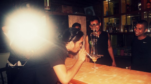 Law trying out flaming shots at the bar.